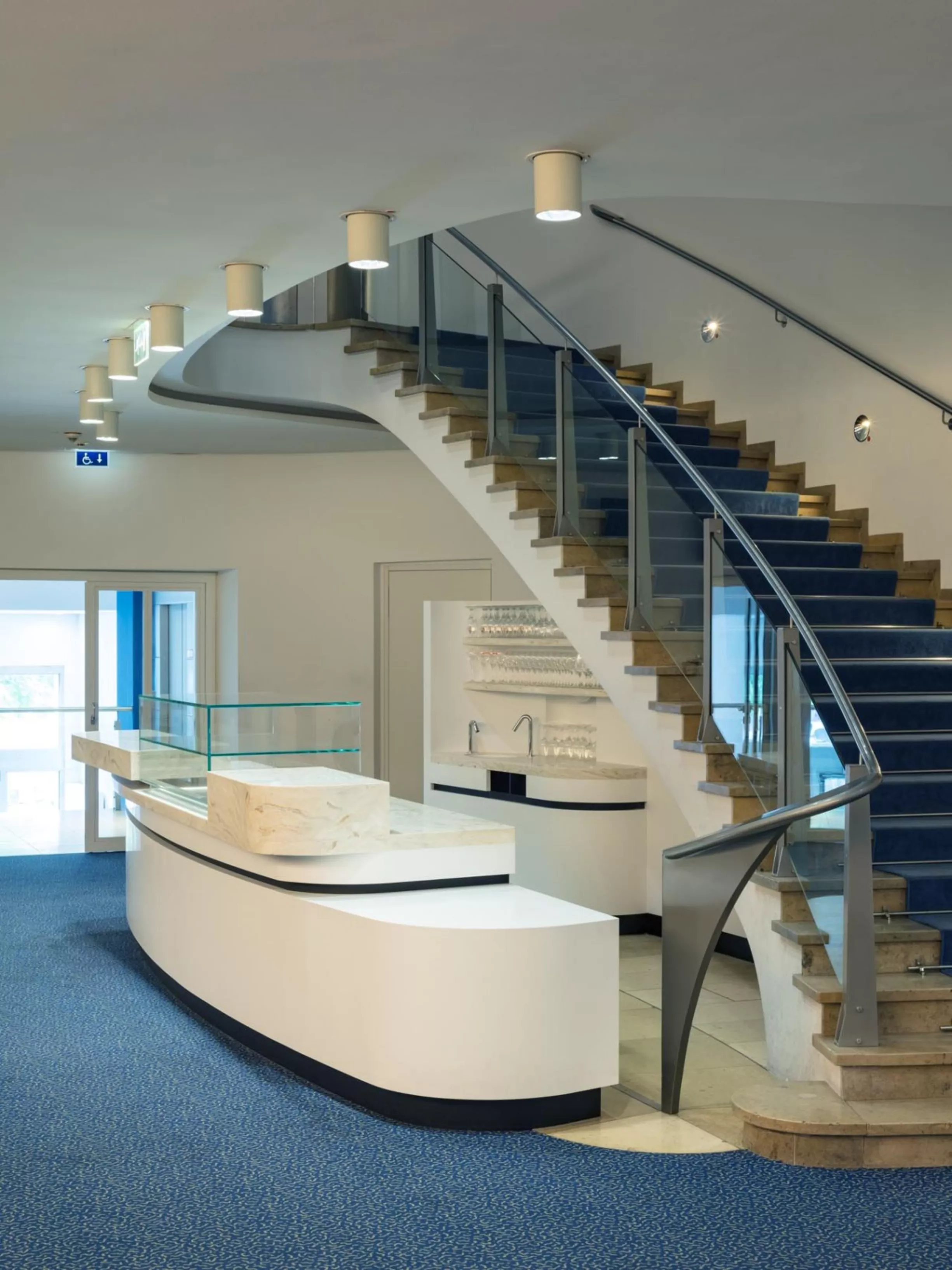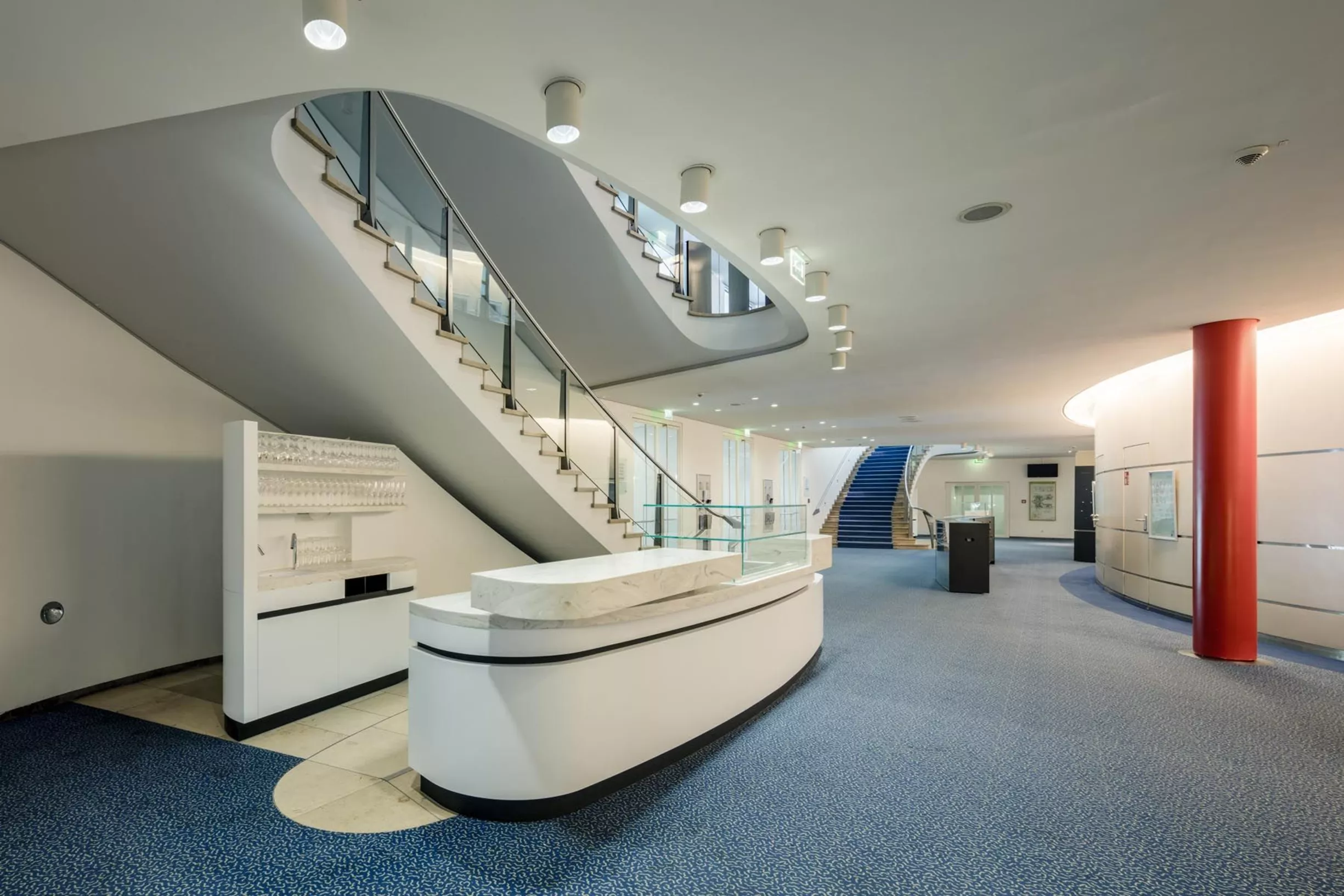 Die Gestaltung der neuen Theken nimmt die schwungvolle Form der Foyer-Treppen aus den 50er Jahren auf. Das barrierefreie Design der Theken mit 2 Thekenhöhen hilft mobilitätseingeschränkten Besuchern bei der Bestellung. Der Caterer freut sich über die repräsentativen Glashauben für die Canapés und die neue Kühltechnik.