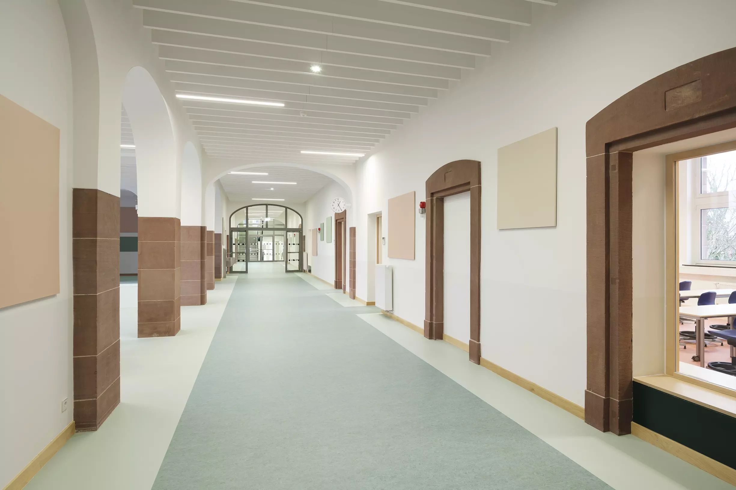 Das Büro HGP Architekten war für die Planung und Umsetzung des Projekts verantwortlich und konnte den Einzug der Schule in den Winterferien 2025 begleiten. Ein wesentlicher Schwerpunkt lag dabei auf der Neuorganisation des Raumprogramms und der Koordination von 68 ausführenden Firmen und 12 Planungsbüros. Das zentrale Entwurfsthema war der bewusste Umgang mit dem Bestand. Historische Elemente wie Sandsteingliederungen und Rundbögen, die im Laufe der Jahrzehnte überformt oder verschlossen worden waren, wurden freigelegt und wieder sichtbar gemacht. Gleichzeitig wurde ein Farb‑ und Materialkonzept entwickelt, das die bauzeitlichen Qualitäten des Gebäudes betont und ihnen eine zeitgemäße, kindgerechte Atmosphäre gegenüberstellt.