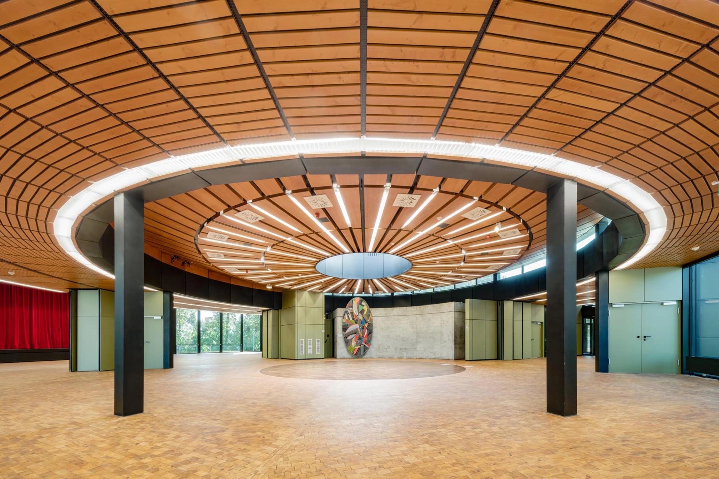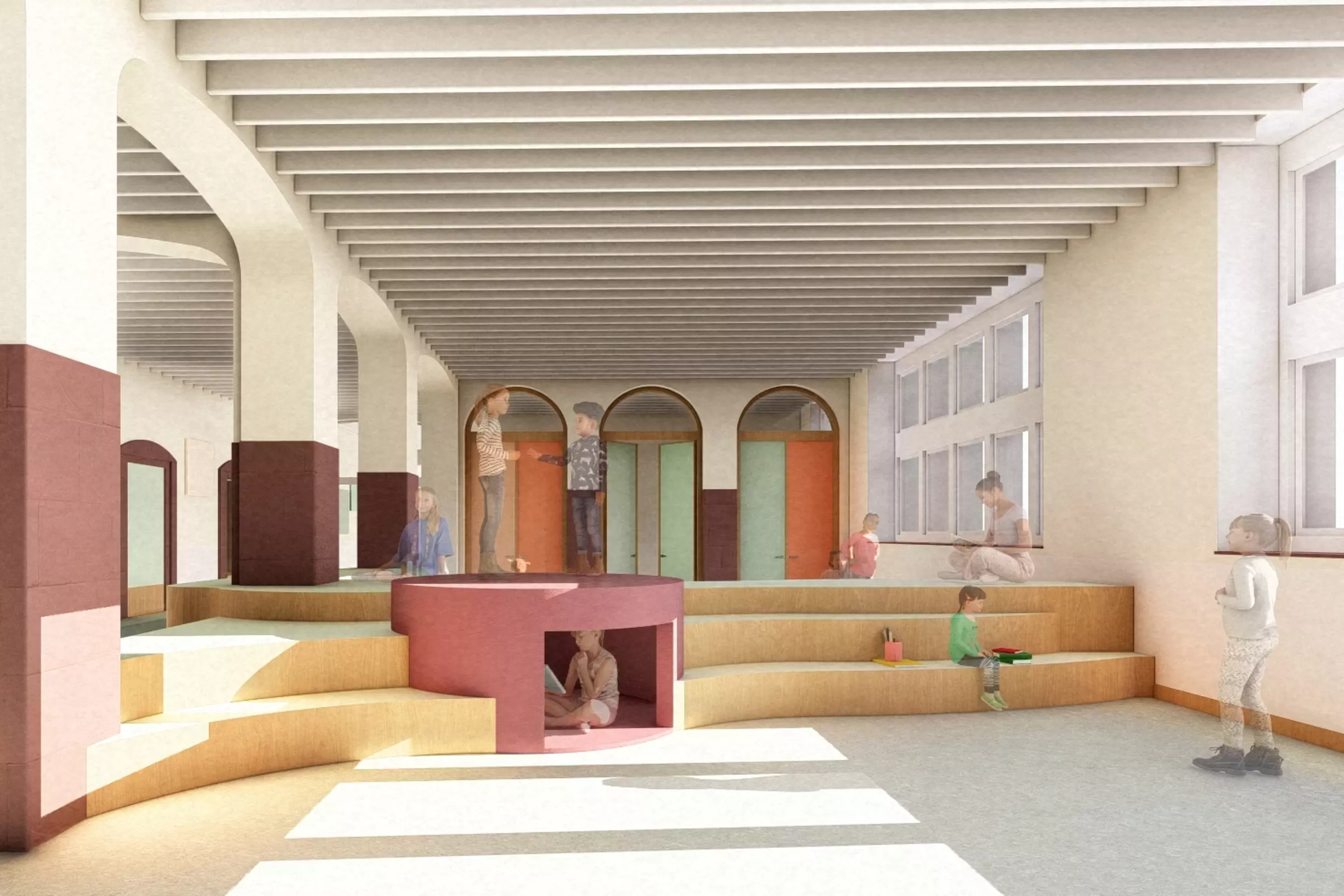 Das ursprünglich als klassische Flurschule konzipierte Gebäude wurde so weiterentwickelt, dass unterschiedliche Lern‑ und Lehrformen möglich sind. Durch die Öffnung von Flurzonen entstanden flexibel nutzbare Lernlandschaften mit integrierten Sitz‑ und Aufenthaltsbereichen.