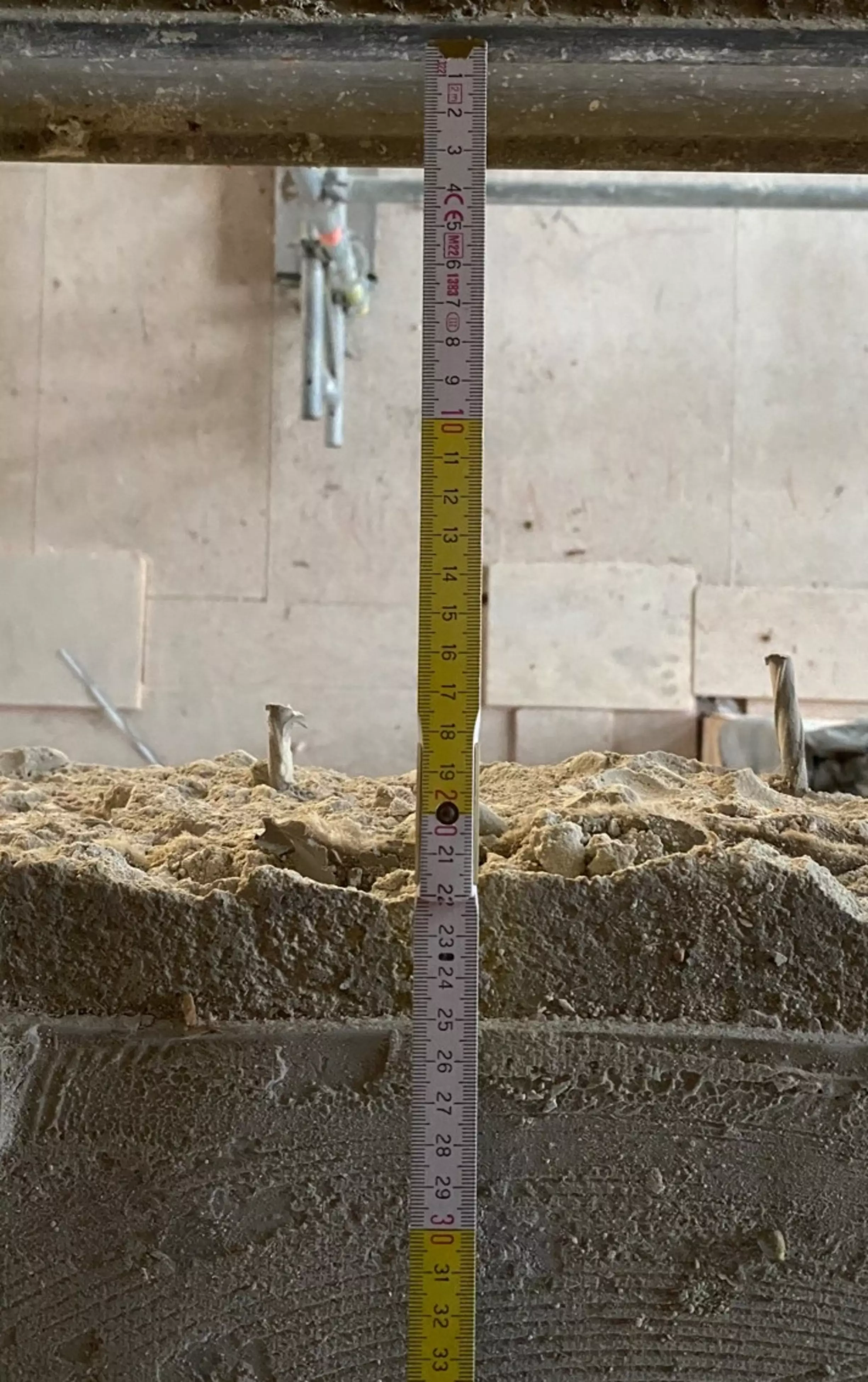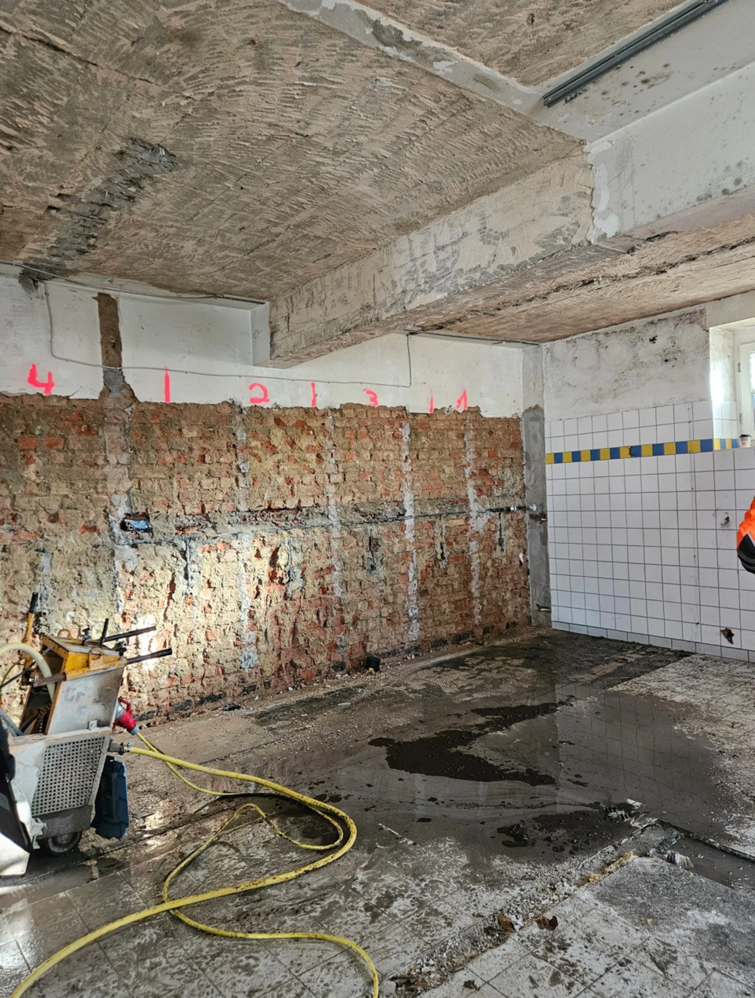 Die Arbeiten an der Diesterwegschule nehmen Fahrt auf. Die Erdarbeiten sind in vollem Gange, Spundwände sind gestellt und die Erdarbeiten am Gebäude sind in Vorbereitung, so dass im „Pilger-Schritt-Verfahren“ wechselweise der Aushub erfolgt, so dass die Lastübertragung in das Erdreich erhalten bleibt. Der Abbruch des Putzes deckt auch hier wieder die inneren Werte auf.