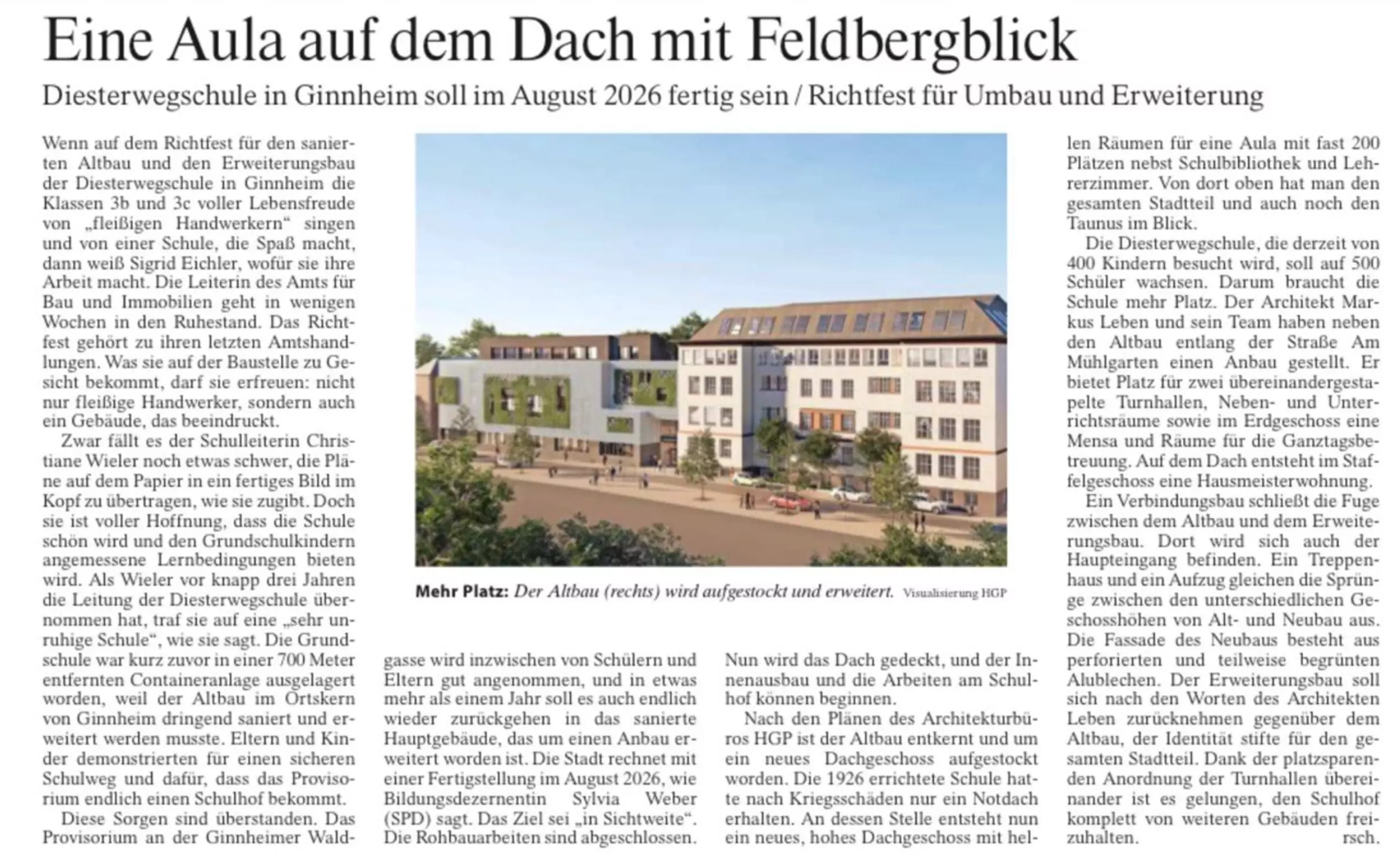 Wir danken dem Amt für Bau und Immobilien der Stadt Frankfurt für die vertrauensvolle Zusammenarbeit sowie unserem Team der HGP Architekten, den Fachplanerinnen und Fachplanern, Ingenieurinnen und Ingenieuren und ganz besonders den Handwerkerinnen und Handwerkern vor Ort. Gemeinsam schaffen wir einen Ort für modernes Lernen und Zusammenhalt.