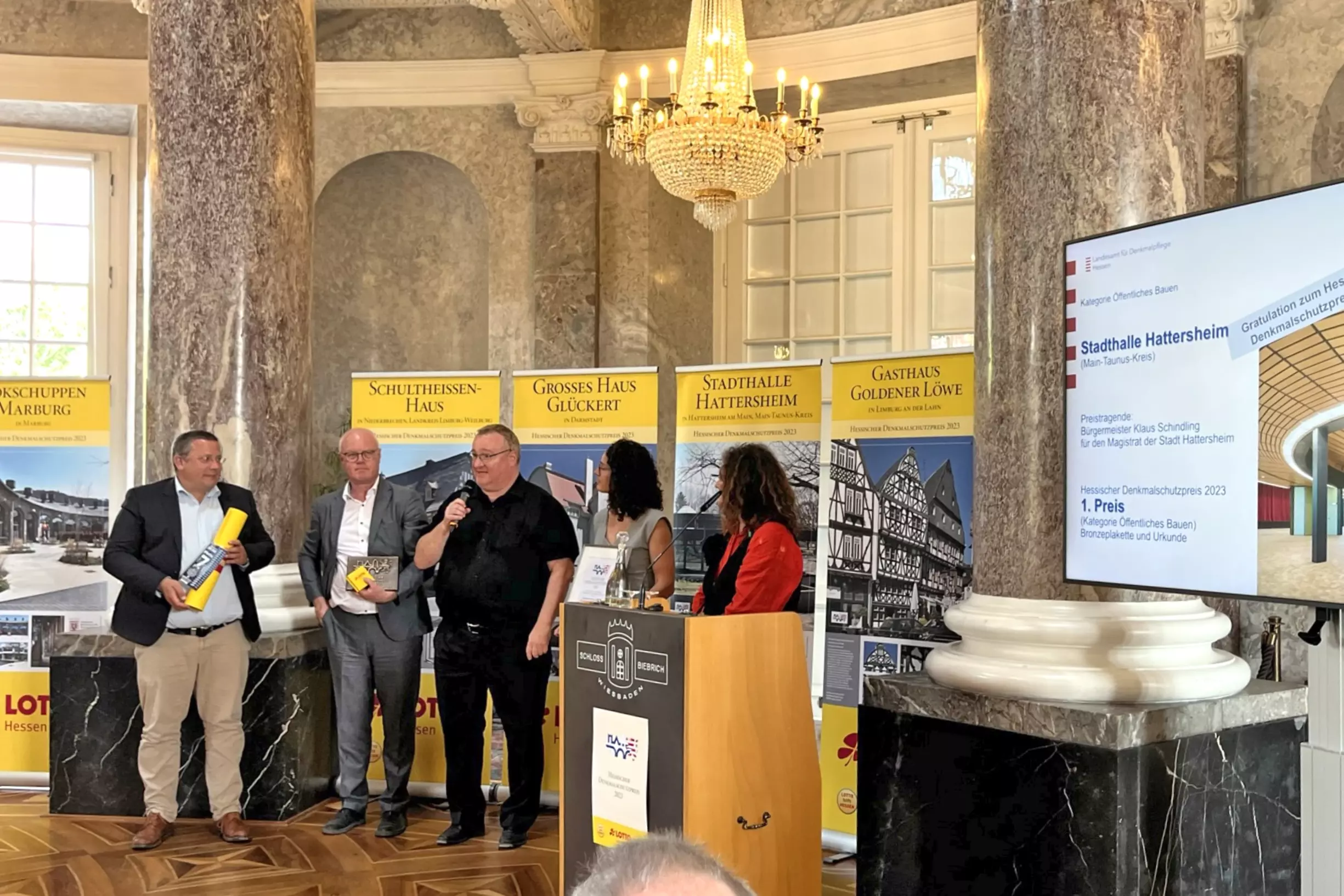 „Der hessische Denkmalschutzpreis würdigt (...) die Stadthalle in Hattersheim als ein wegweisendes Beispiel für den Umgang mit Kulturdenkmal der 1970er Jahre.“